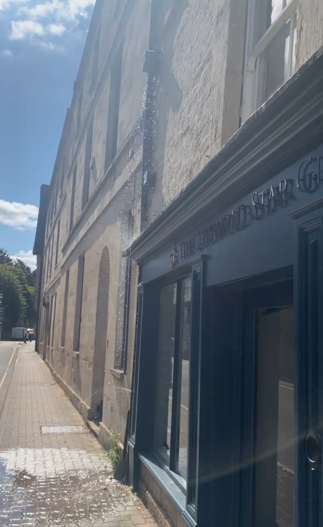 Dollar Street Cirencester: Blocked rainwater downpipe with suspected contamination with foul water? It’s being going on for months at the old Whiddett’s Bakery, now Star developments, with what looks like sink waste all over the street.
