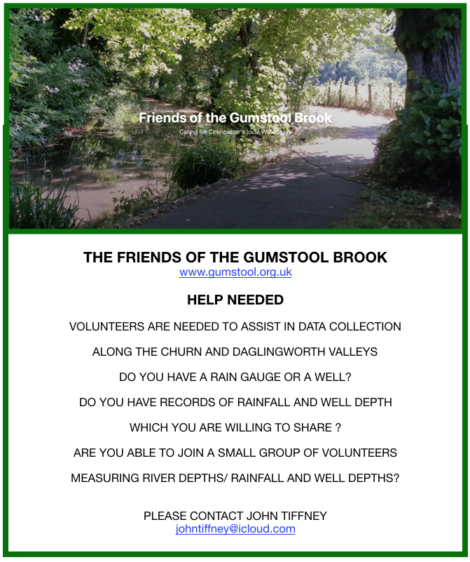 We are a group of local people interested in Cirencester’s Gumstool Brook and its associated streams – all connected to the River Churn in one way or another.